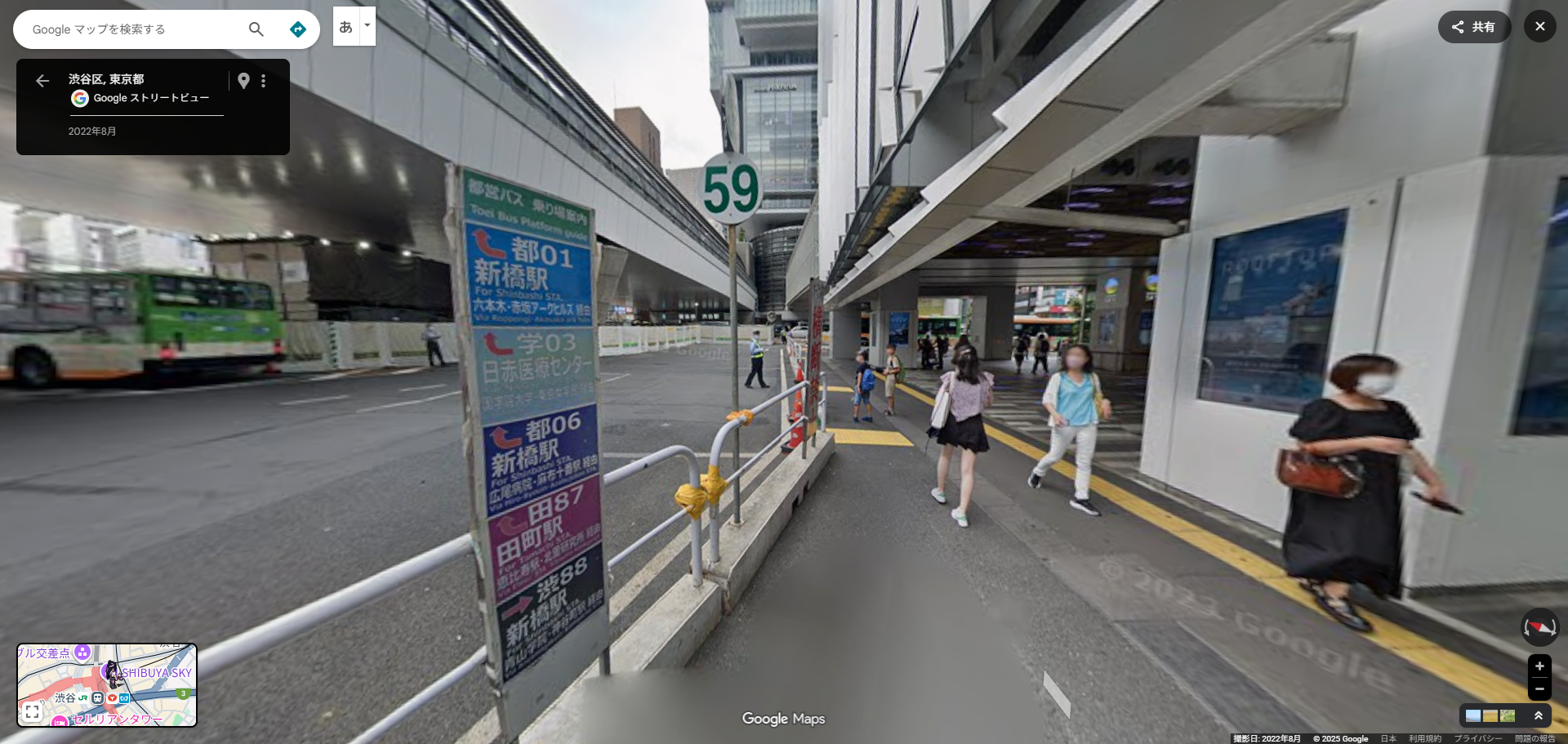 バス停59番は、渋谷スクランブルスクエアの近くです。最上部の「SHIBUYA SKY」は、渋谷最高峰約230mのパノラマビューを誇り、日本最大級の屋上展望空間を有する展望施設です。